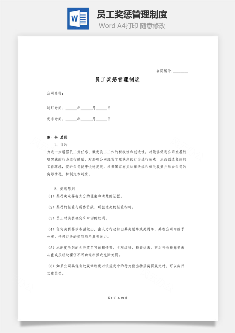 本模板为员工奖惩管理制度Word文档,文字图片可以直接替换,使用简单方便